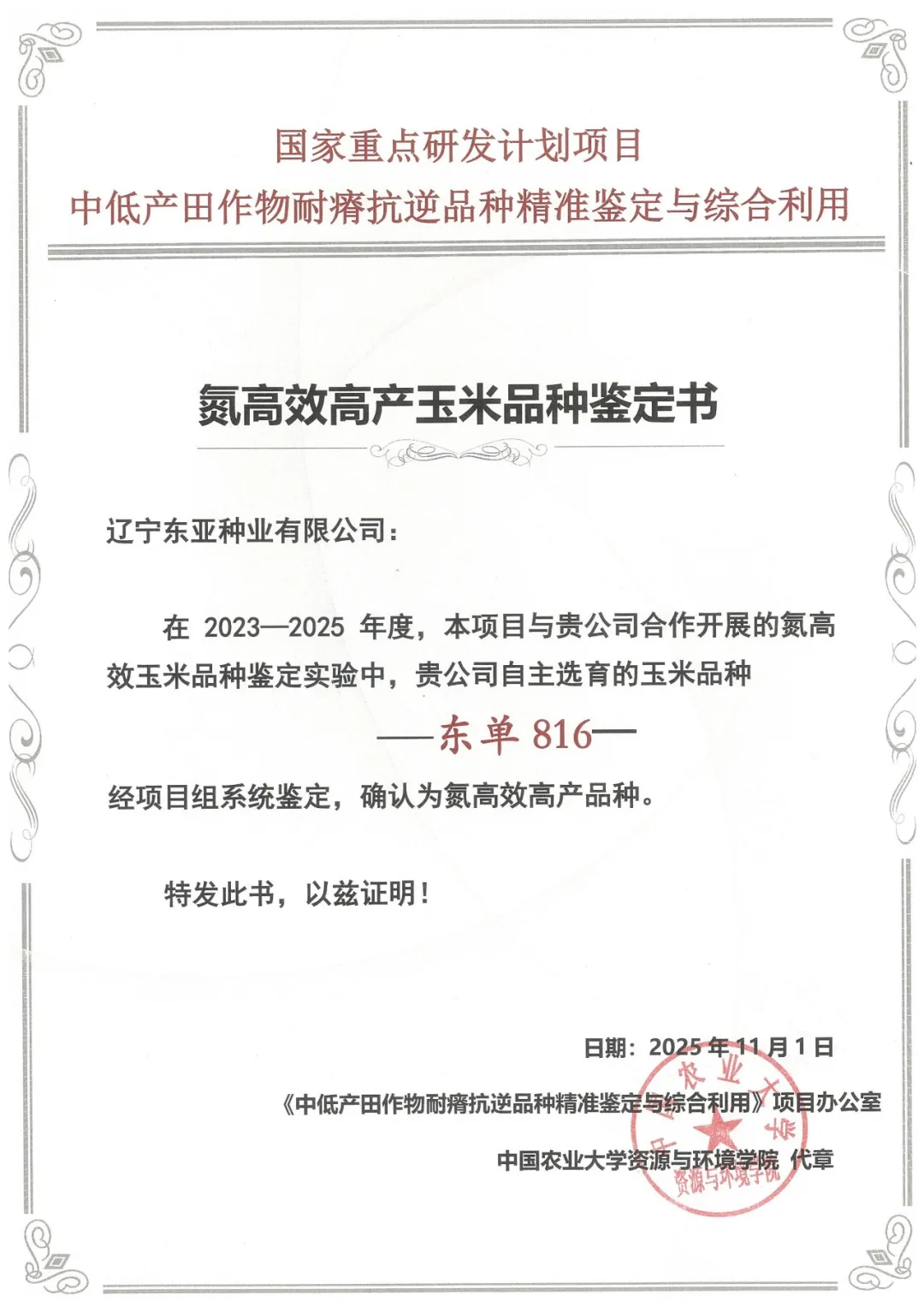 春启农时,良种先行;科技兴种,实干践责。近日,辽宁东亚种业有限公司自主培育的玉米品种东单816,经中国农业大学权威鉴定,正式确认为氮高效高产品种。这一成果既是东亚种业深耕科研育种、坚守“科技兴种、良种惠民”使命的生动实践,也是公司在绿色种业发展道路上的重大突破,为我国玉米产业减肥增效、高质量发展注入强劲动能。
