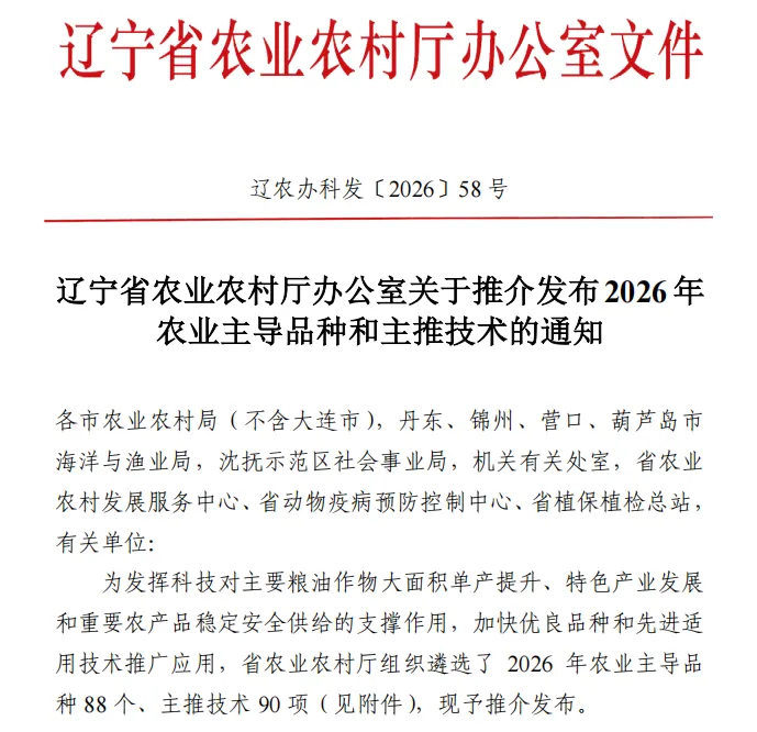 近日,辽宁省农业农村厅发布了2026年农业主导品种和主推技术通知,辽宁东亚种业自主培育的东单1331、东科1188入选2026年辽宁省农业主导品种。